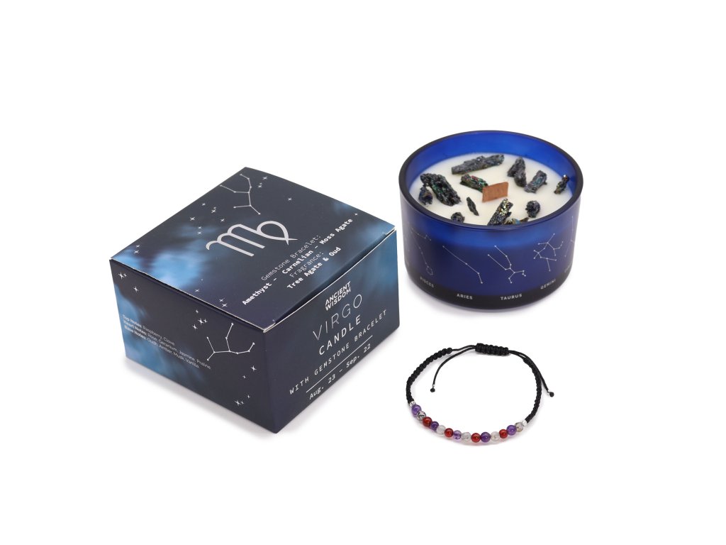 Prijmite praktickú, no zároveň hlboko intuitívnu energiu Panny s touto kryštáľovou sviečkou a náramkom z drahokamov.