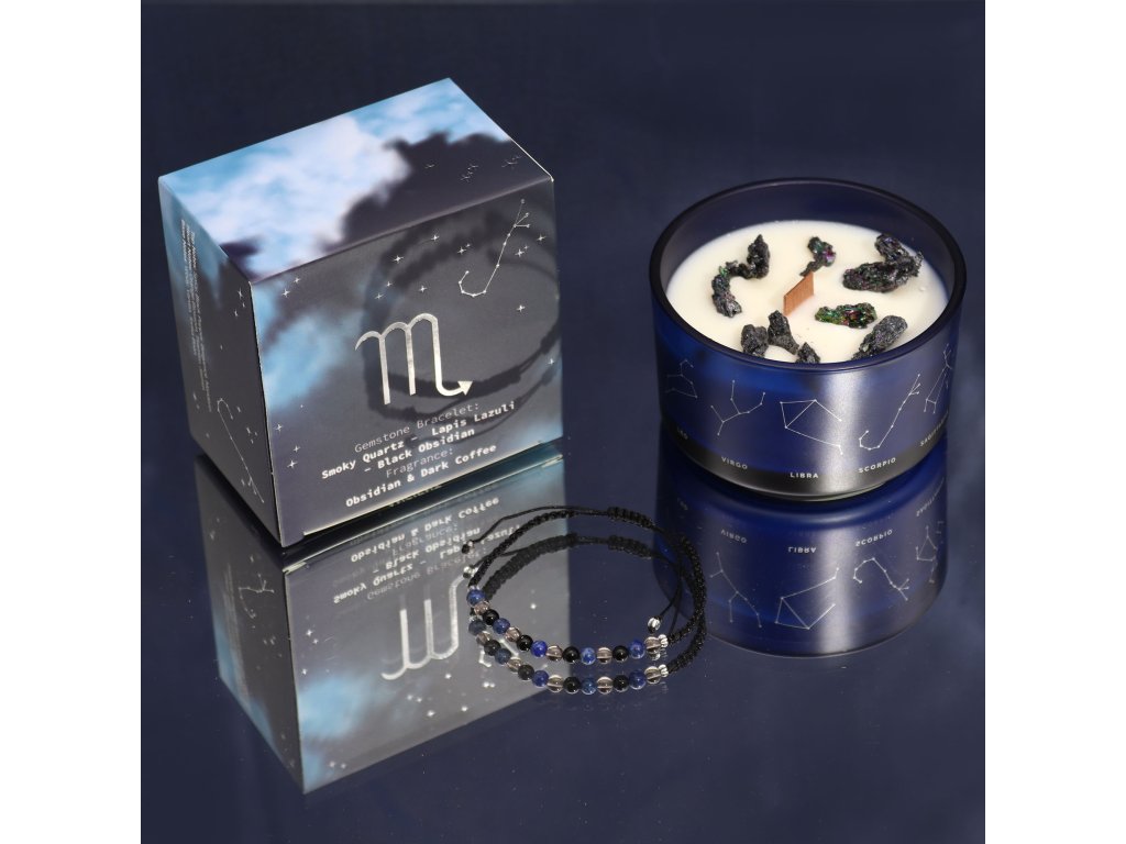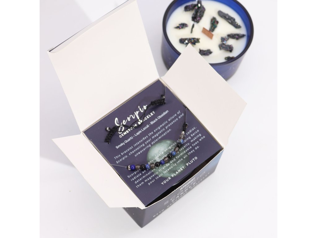 Nasmerujte intenzívnu a transformačnú energiu Škorpióna s touto kryštáľovou sviečkou a náramkom z drahokamov.