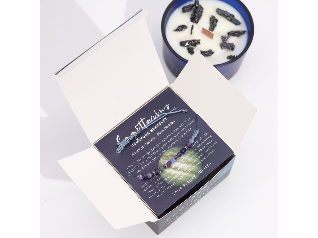 Prijmite dobrodružnú a slobodomyseľnú energiu Strelca s touto kryštáľovou sviečkou a náramkom z drahokamov.