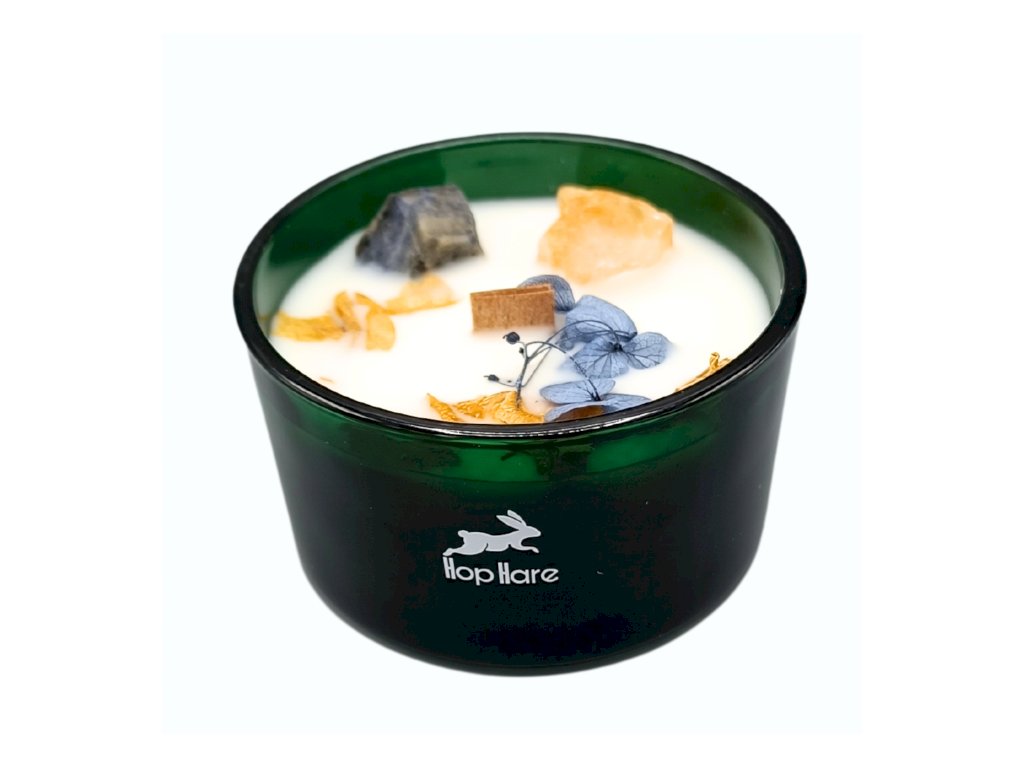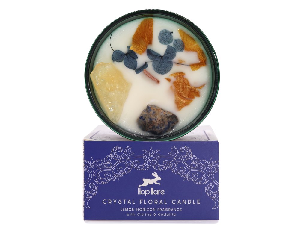 Sviečka s kryštáľom Slnko spája svieži kokteil citrusových tónov so silou kryštálov citrínu a sodalitu. Prináša do priestoru teplo, svetlo a pozitívnu energiu.