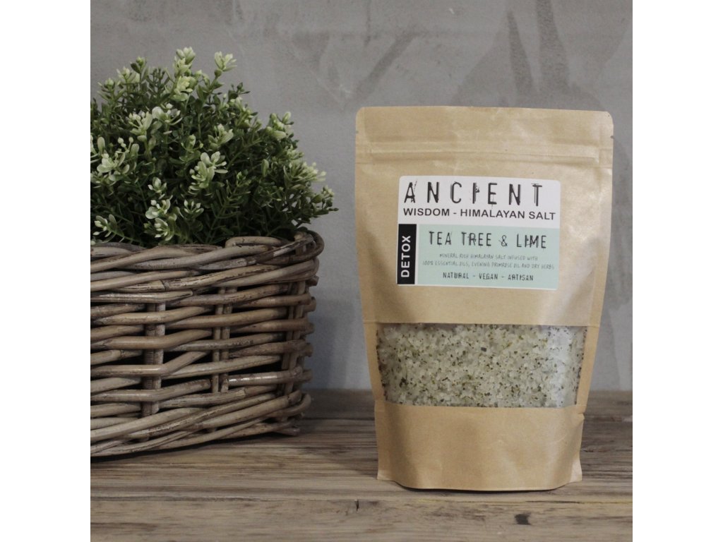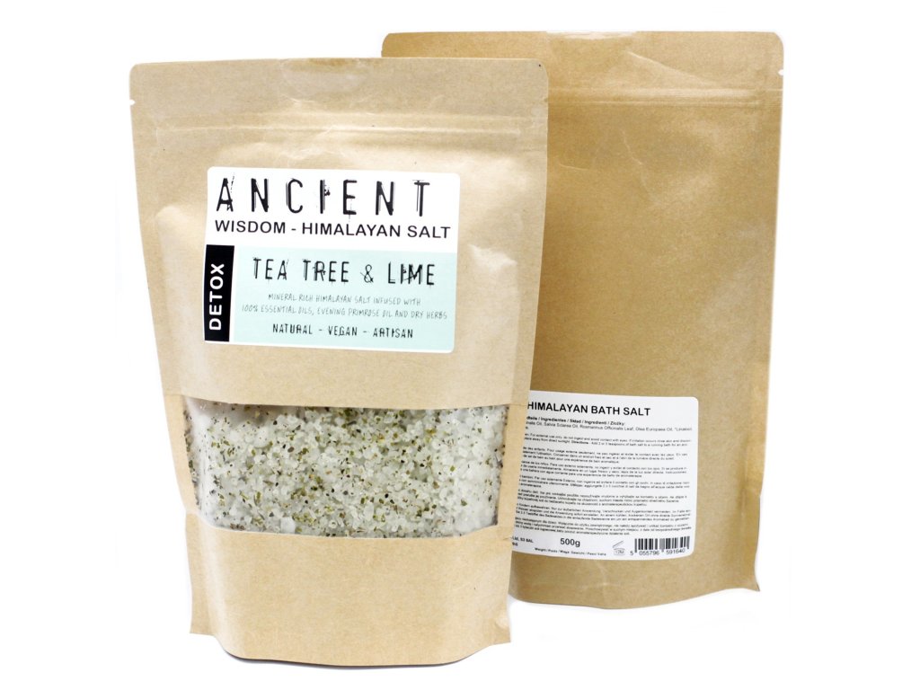 Luxusná himalájska soľ Detox s 84 minerálmi, silicou čajovníka a limetky a pupalkovým olejom – ideálna na očistný a relaxačný kúpeľ pre telo i myseľ.